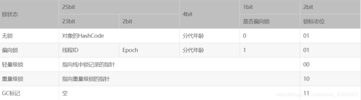 - 偏向锁:加锁信息。通过修改 ThreadId 来实现加锁