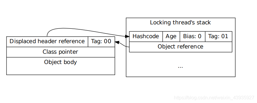 线程在执行同步块之前,JVM 会先在当前的线程的栈帧中创建一个 Lock Record,其包括一个用于存储对象头中的 mark word(官方称之为 Displaced Mark Word)以及一个指向对象的指针。下图右边的部分就是一个 Lock Record。