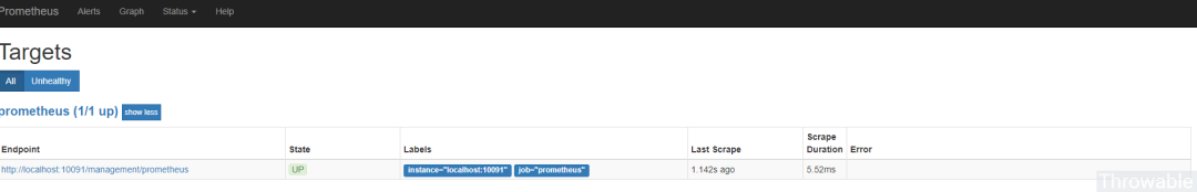 此时,访问ttp://${虚拟机host}:9090/targets就能看到当前Prometheus中执行的Job