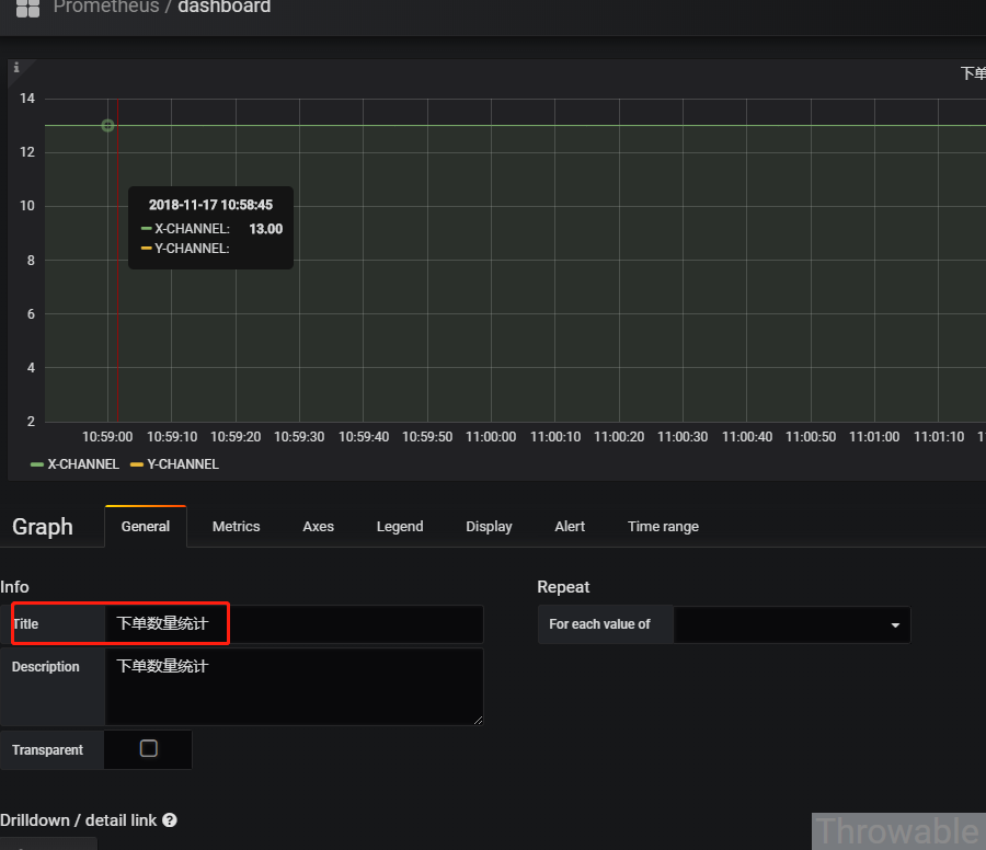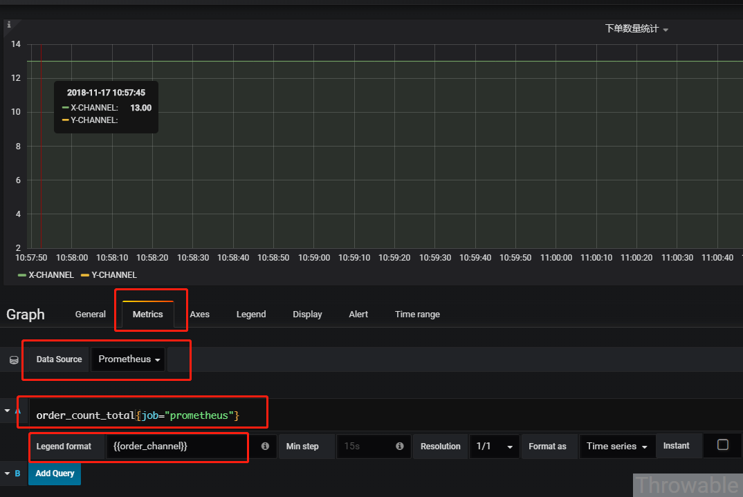 其实就是指向Prometheus服务端的端口就可以了。接下来可以天马行空地添加需要的面板,就下单数量统计的指标,可以添加一个Graph的面板