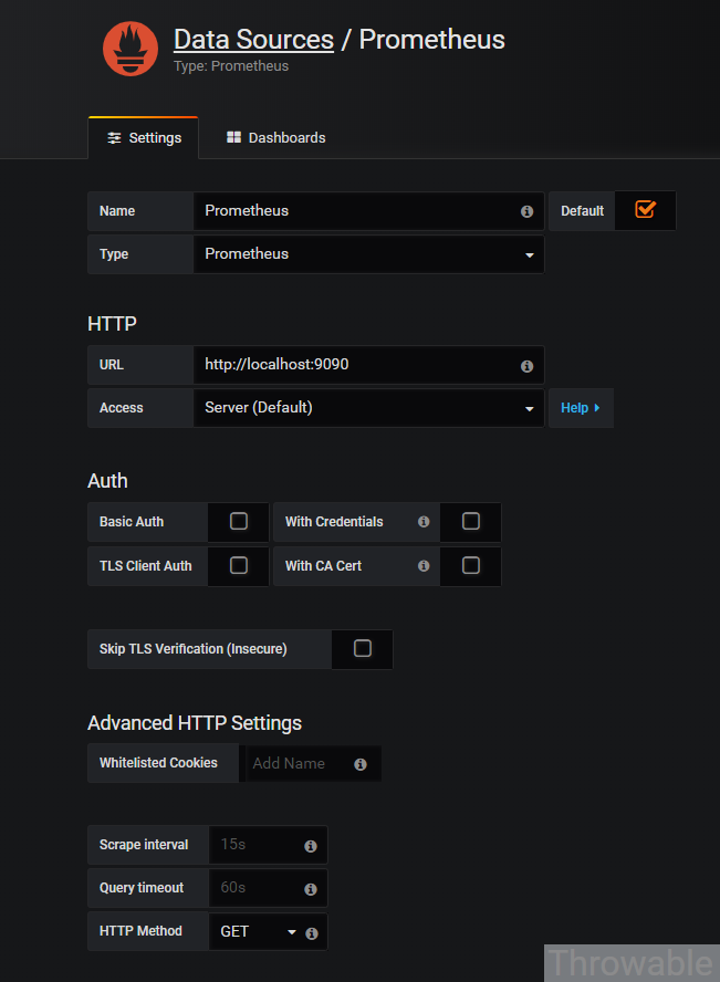 安装完成后,通过命令service grafana-server start启动即可,默认的启动端口为3000,通过ttp://${host}:3000即可。初始的账号密码都为admin,权限是管理员权限。接着需要在Home面板添加一个数据源,目的是对接Prometheus服务端从而可以拉取它里面的度量数据。数据源添加面板如下: