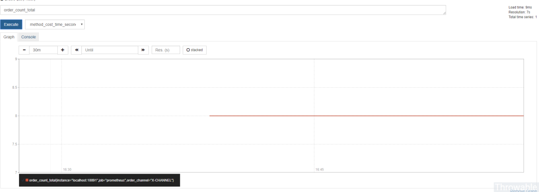 我们先对应用的/order接口进行调用,然后查看一下监控前面在应用中定义的rder_count_total``ethod_cost_time_seconds_sum