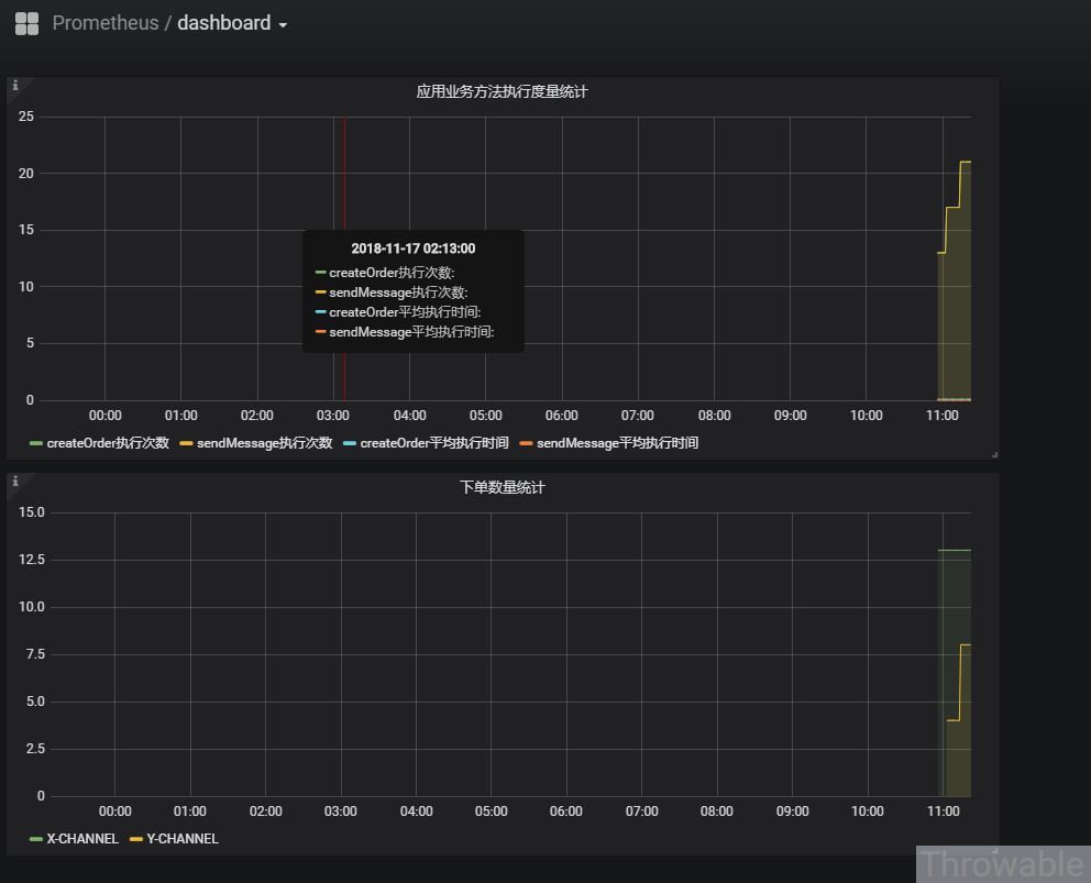 前面提到的两项是基本配置,其他配置项一般是图表展示的辅助或者预警等辅助功能,这里先不展开,可以取Grafana的官网挖掘一下使用方式。然后我们再调用一下下单接口,过一段时间,图表的数据就会自动更新和展示: