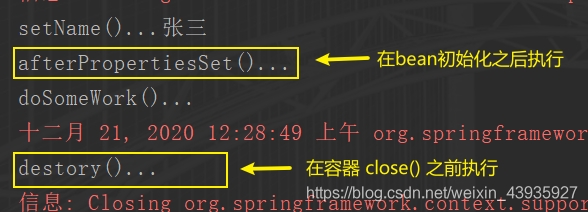 可以看到 afterPropertiesSet() 方法就如同它的名字所表示的那样,是在 Bean 的属性都被设置完毕之后才会调用;而 destory() 方法是在手动调用 close() 关闭 IOC 容器后才会调用。