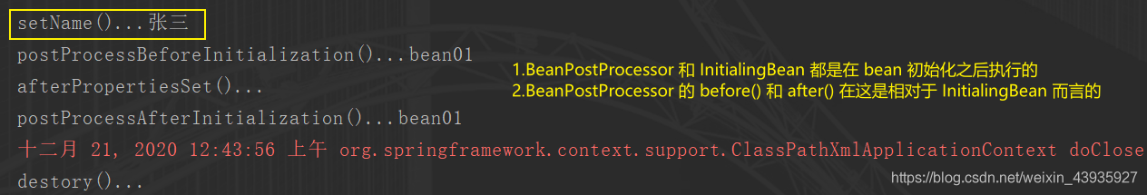 执行顺序:bean中的初始化方法 -->BeanPostProcessor#before–>InitializingBean–>BeanPostProcessor#after