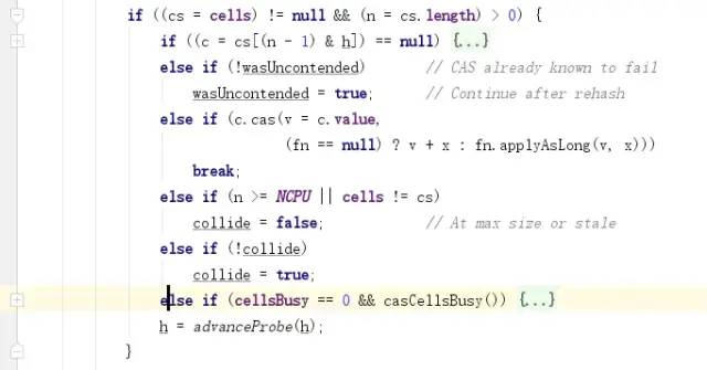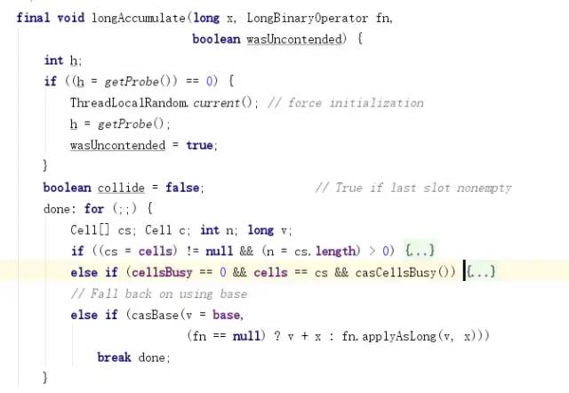 再回到第一行,整体解释下这个判断:如果cell[]已经被初始化了,或者有竞争,才会进入到第二行代码。如果没有竞争,也没有初始化,就不会进入到第二行代码。