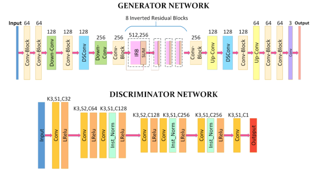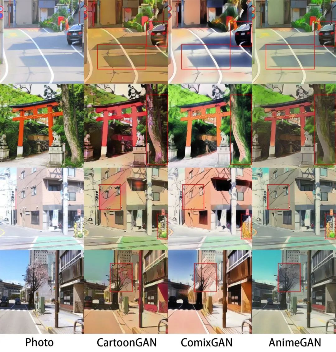 尽管最近 2019 年的图灵奖颁给了计算机图形学、颁给了皮克斯 3D 动画,但很多人可能认为二维动漫更有意思一些。像宫崎骏、新海诚这些大师手绘下的动漫,才有了灵魂,张张都能成为壁纸,而整个日漫也以二维为核心。如果有模型能将真实画面转化为日漫风格的手绘画面,那一定非常炫酷。最近机器之心发现确实有这些模型,从 CartoonGAN 到 AnimeGAN 都能生成非常有意思的图像。这里有一个 TensorFlow 新项目,它实现了 AnimeGAN,并提供了预训练模型。也就是说,我们下载后可以直接试试生成效果。作为日漫风格的爱好者,我们很快就试用了一下新项目。项目地址:https://github.com/TachibanaYoshino/AnimeGAN虽然原项目给出的最佳示例很多都是街景,但我们发现各种场景也都还行,如下是我们试用的原图与生成效果。看看第一张樱花道生成效果,忽然有一种《千与千寻》的感觉。如果只针对人物,转换效果也是非常不错的。我们尝试将新垣结衣的照片输入 AnimeGAN 模型,然后就有如下这种神奇的画风,感觉直接用到动漫里也没什么问题了。在原 GitHub 项目中,作者还给了非常多的示例,上面只是机器之心试用的结果,你也可以来用一用。整个项目实现的是论文「AnimeGAN: a novel lightweight GAN for photo animation」中所提方法,作者在论文中分别将 AnimeGAN 与 CartoonGAN、ComixGAN 进行对比。从图中可以看到,AnimeGAN 在细节方面的表现要优于以上两种方法,色彩相对而言更加自然,涂抹感也没有那么强烈。最明显的是第二行的效果图,使用 AnimeGAN 生成的漫画更加接近宫崎骏的画风。对于这个项目的 AnimeGAN,如下所示为 AnimeGAN 所采用的生成器网络与判别器网络。看起来模型整体是比较常规地一个卷积神经网络,但它会采用实例归一化以及新型的 LReLU 激活函数。除了架构细节上的更新外,作者还提出了以下三个新的损失函数:灰度风格(grayscale style)loss