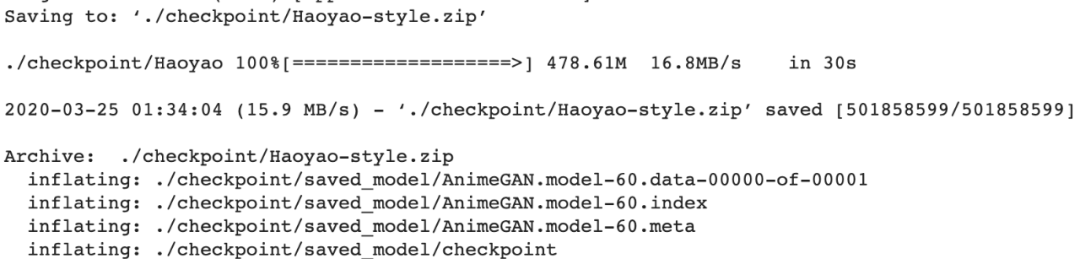 保存后退出,以上命令会将预训练的模型、vgg19 权重以及训练数据集下载并保存到其对应目录下。在 notebook 中运行:至此即完成所有准备工作,运行如下代码就可以对模型进行训练了:!python main.py --phase train --dataset Hayao --epoch 101 --init_epoch 1