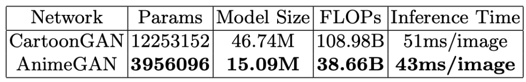 下表比较了 ACartoonGAN 与 AnimeGAN 的模型大小与推理速度。可以明显看出,AnimeGAN 是个相对轻量级的 GAN,具有更少的参数量以及更快的推理速度。总体来说,新提出来的 AnimeGAN 是一种轻量级的生成对抗模型,它采用了较少的模型参数,以及引入格拉姆矩阵(Gram matrix)来加强照片的风格。研究者的方法需要采用一系列真实图片与一系列动漫图片做训练,且这些图片并不需要成对匹配,这就表明训练数据非常容易获得。我们在 Ubuntu 18.04 下对本项目进行了测试,相关依赖环境如下:python 3.6.8