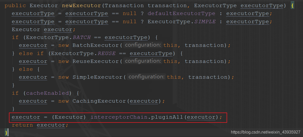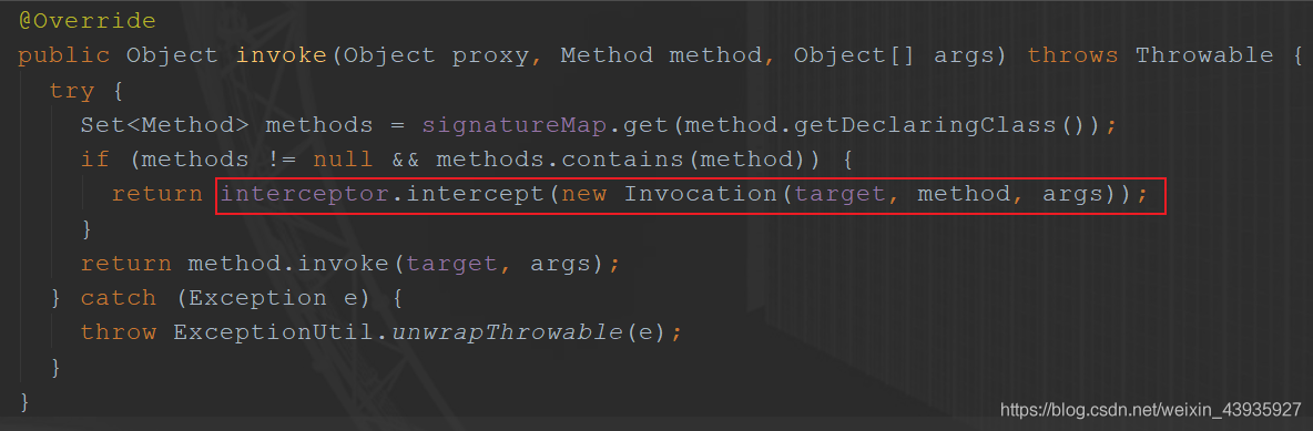 在上面我们看到了,在创建 JDK 动态代理时,传入的是一个新的 Plugin 实例,所以实现 InvocationHandler 接口的就是 Plugin 类本身