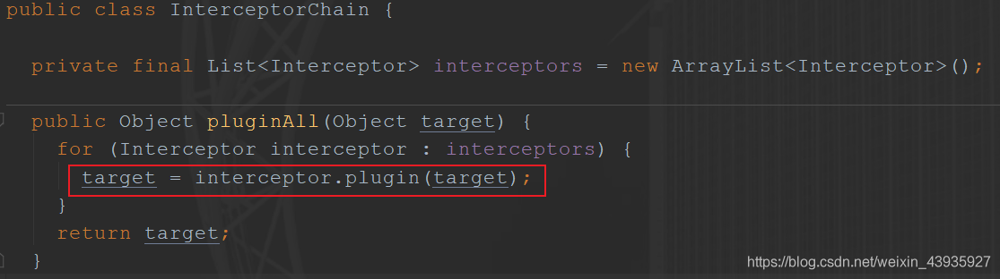 可以看到,它是对传进来的 target 不断调用每个 Interceptor 的 plugin() 方法层层创建代理。