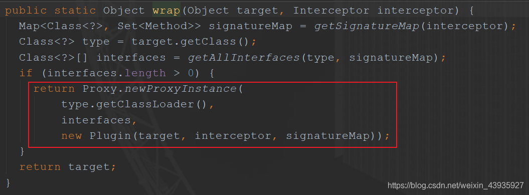 可以看到,PageHelper 的 plugin 方法是直接调用了 MyBatis 提供的 Plugin 类的 wrap方法,
