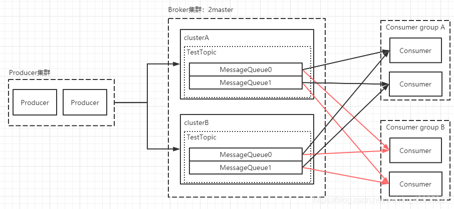 首先,站在master角度看看Consumer是如何分配拉取消息的。假设有两个master节点的集群,分别是A,B一个消费者组,组中有2个consumer。