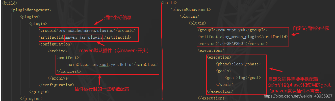 关于插件的配置一般是在pom文件的<plgin>标签中,具体关系是:<bulid>:<pluginManagement>:<plugins>:<plugin>。下图是关于maven默认插件和自定义插件的配置示例: