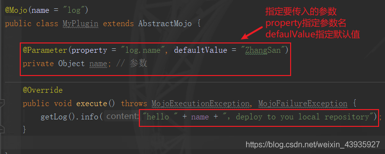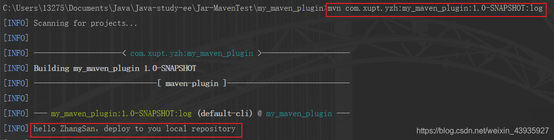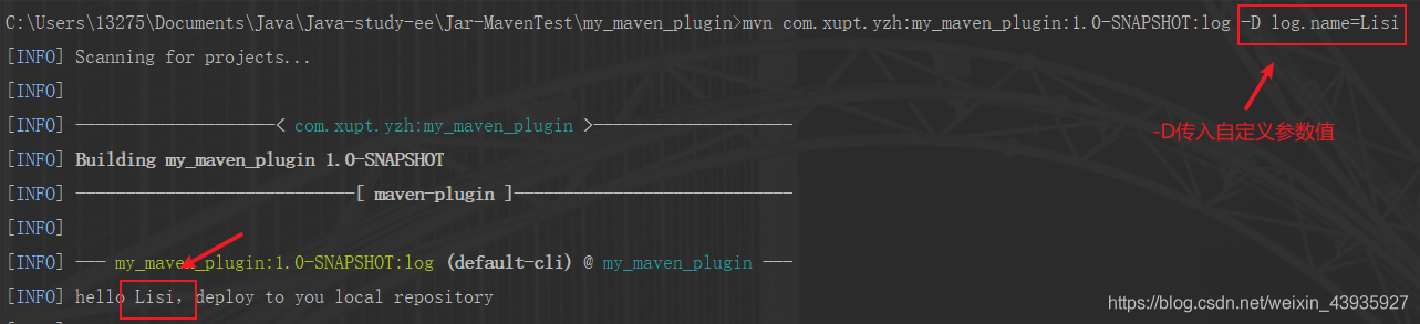 另外,在执行命令时还可以传入参数,mvn com.xupt.yzh:my_maven_plugin:1.0-SNAPSHOT:log -D log.name=Lisi
