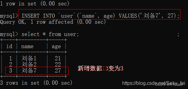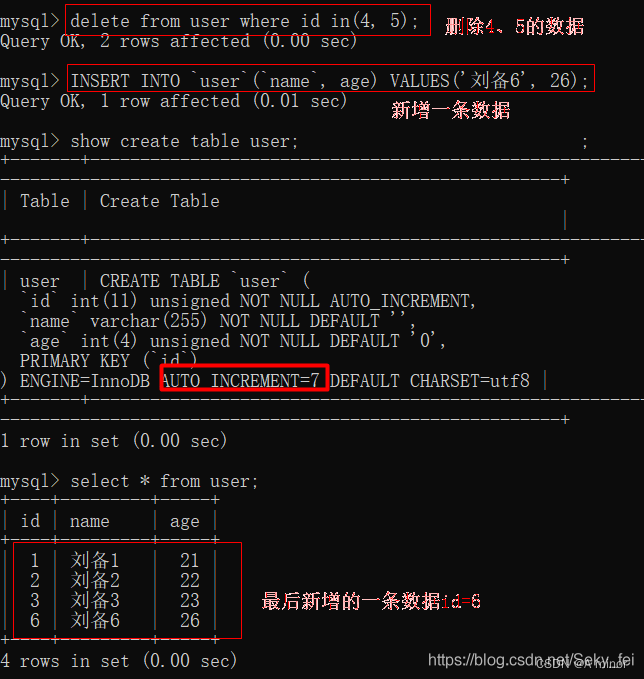 在user表里删除id为4、5的数据,再向user表中插入一条数据,主键ID是auto-increment的值6。