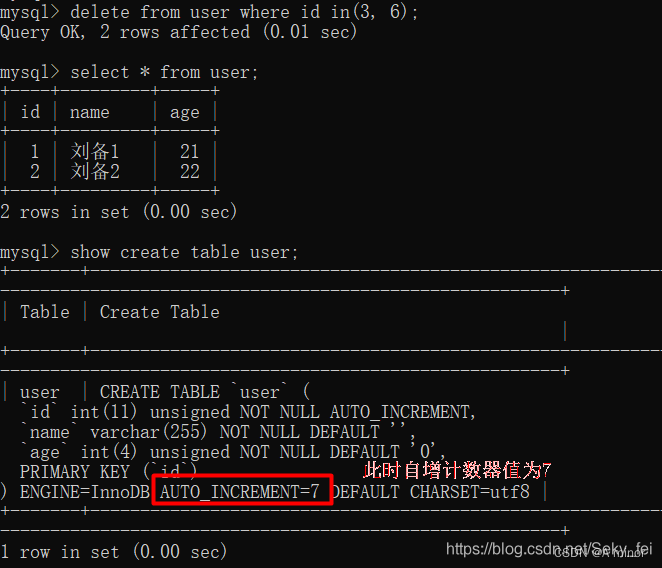 在场景一的基础上,在删除id为6、3的数据后,此时auto-increment计数器的值为7,user表里的id最大是2。
