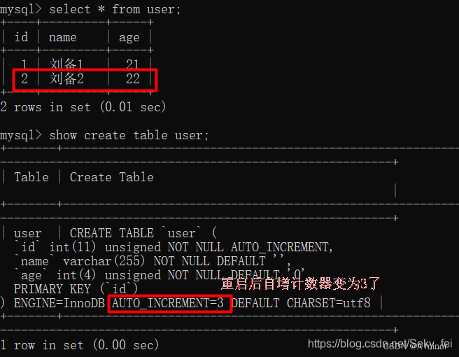 然后重启数据库后,auto-increment计数器的值变为3,也就是user表里的自增列ID的最大值2加1。