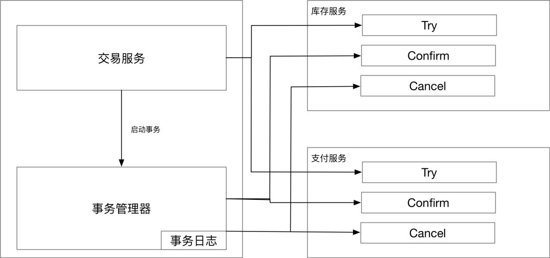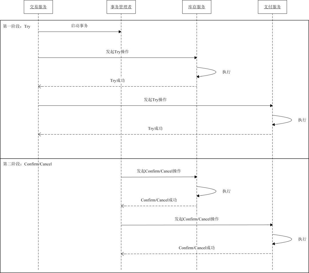 // try 方法(confirmMethod = "confirmRecord", cancelMethod = "cancelRecord", transactionContextEditor = MethodTransactionContextEditor.class)public String record(TransactionContext transactionContext, CapitalTradeOrderDto tradeOrderDto) {}// confirm 方法public void confirmRecord(TransactionContext transactionContext, CapitalTradeOrderDto tradeOrderDto) {}// cancel 方法public void cancelRecord(TransactionContext transactionContext, CapitalTradeOrderDto tradeOrderDto) {}