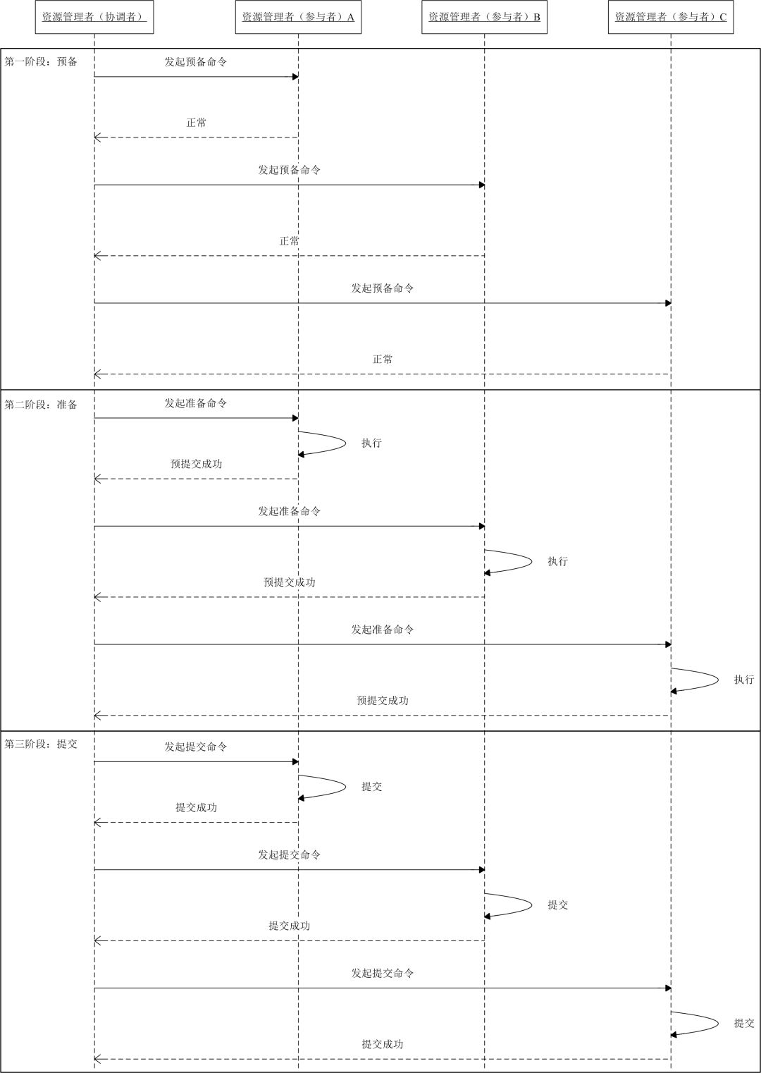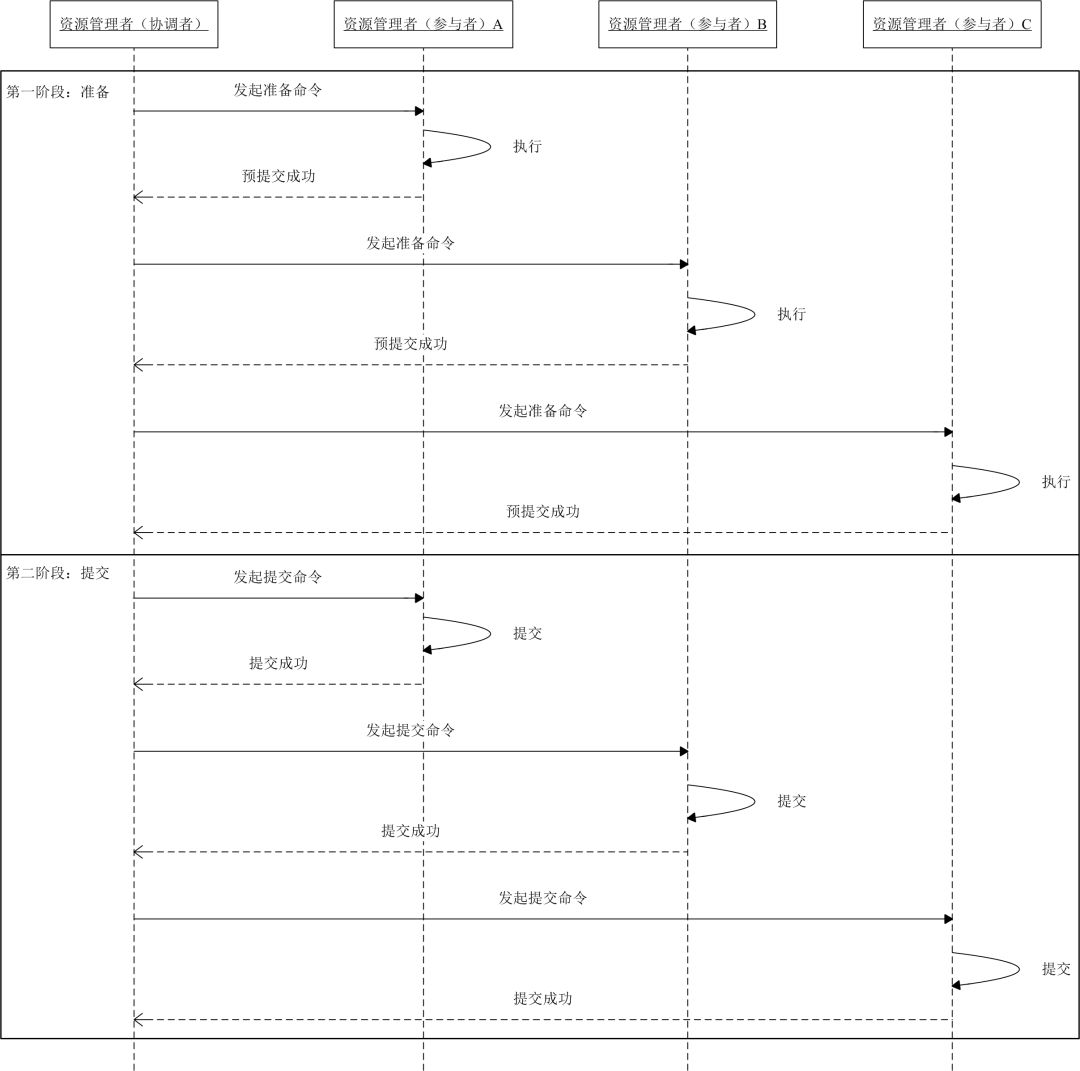 二阶段提交协议,顾名思义,它具有两个阶段:第一阶段准备,第二阶段提交。这里,事务管理者(协调者)主要负责控制所有节点的操作结果,包括准备流程和提交流程。第一阶段,事务管理者(协调者)向资源管理者(参与者)发起准备指令,询问资源管理者(参与者)预提交是否成功。如果资源管理者(参与者)可以完成,就会执行操作,并不提交,最后给出自己响应结果,是预提交成功还是预提交失败。第二阶段,如果全部资源管理者(参与者)都回复预提交成功,资源管理者(参与者)正式提交命令。如果其中有一个资源管理者(参与者)回复预提交失败,则事务管理者(协调者)向所有的资源管理者(参与者)发起回滚命令。举个案例,现在我们有一个事务管理者(协调者),三个资源管理者(参与者),那么这个事务中我们需要保证这三个参与者在事务过程中的数据的强一致性。首先,事务管理者(协调者)发起准备指令预判它们是否已经预提交成功了,如果全部回复预提交成功,那么事务管理者(协调者)正式发起提交命令执行数据的变更。