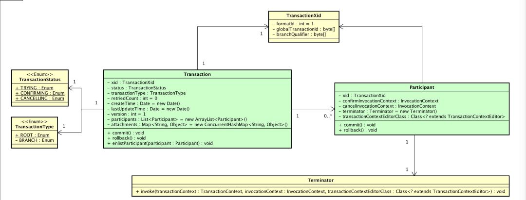 这里,需要特别关注 TransactionContext 事务上下文,因为我们需要远程调用服务的参与者时通过参数的形式传递事务给远程参与者。在 tcc-transaction 中,一个事务org.mengyun.tcctransaction.Transaction可以有多个参与者org.mengyun.tcctransaction.Participant 参与业务活动。其中,事务编号 TransactionXid 用于唯一标识一个事务,它使用 UUID 算法生成,保证唯一性。当参与者进行远程调用时,远程的分支事务的事务编号等于该参与者的事务编号。通过事务编号的关联 TCC confirm / cancel 方法,使用参与者的事务编号和远程的分支事务进行关联,从而实现事务的提交和回滚。事务状态 TransactionStatus 包含 :尝试中状态 TRYING(1)、确认中状态 CONFIRMING(2)、取消中状态 CANCELLING(3)。此外,事务类型 TransactionType 包含 :根事务 ROOT(1)、分支事务 BRANCH(2)。当调用 TransactionManager#begin() 发起根事务时,类型为 MethodType.ROOT,并且事务 try 方法被调用。调用 TransactionManager#propagationNewBegin() 方法,传播发起分支事务。该方法在调用方法类型为 MethodType.PROVIDER 并且 事务 try 方法被调用。调用 TransactionManager#commit() 方法提交事务。该方法在事务处于 confirm / cancel 方法被调用。类似地,调用 TransactionManager#rollback() 方法,取消事务。