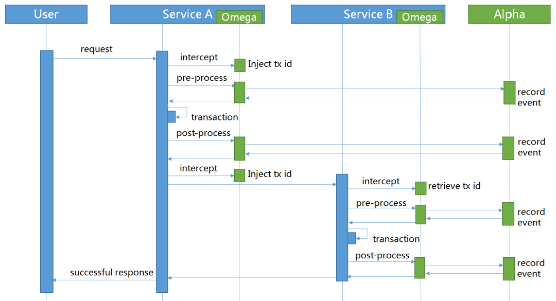 ServiceComb Saga 在其理论基础上进行了扩展,它包含两个组件:alpha 和 omega。alpha 充当协调者,主要负责对事务的事件进行持久化存储以及协调子事务的状态,使其得以最终与全局事务的状态保持一致。omega 是微服务中内嵌的一个 agent,负责对网络请求进行拦截并向 alpha 上报事务事件,并在异常情况下根据 alpha 下发的指令执行相应的补偿操作。在预处理阶段,alpha 会记录事务开始的事件;在后处理阶段,alpha 会记录事务结束的事件。因此,每个成功的子事务都有一一对应的开始及结束事件。在服务生产方,omega 会拦截请求中事务相关的 id 来提取事务的上下文。在服务消费方,omega 会在请求中注入事务相关的 id 来传递事务的上下文。通过服务提供方和服务消费方的这种协作处理,子事务能连接起来形成一个完整的全局事务。注意的是,Saga 要求相关的子事务提供事务处理方法,并且提供补偿函数。这里,添加 @EnableOmega 的注解来初始化 omega 的配置并与 alpha 建立连接。在全局事务的起点添加 @SagaStart 的注解,在子事务添加 @Compensable 的注解指明其对应的补偿方法。使用案例:https://github.com/apache/servicecomb-saga/tree/master/saga-demo