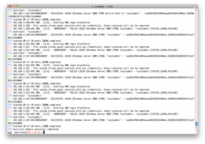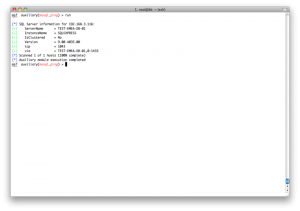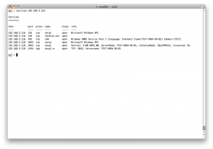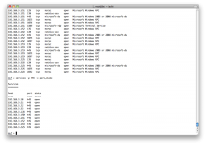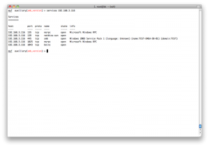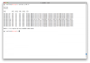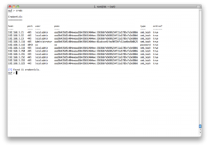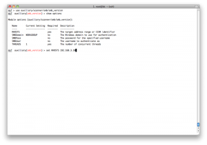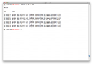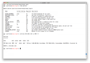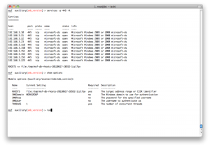 所以我们需要用set命令指定一个特定的hosts,但是那样的话我们就得一个一个的指定hosts,那不得烦死?所以这里metasploit就有一个很方便的地方,我们可以从services表中得到所有开了445端口的主机,生成一个文件,然后把这个文件当作hosts参数: