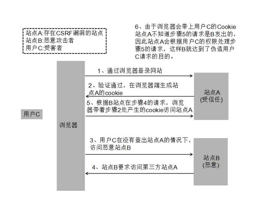B的某个页面向站点A发起请求,而这个请求会带上浏览器端所保存的站点A的cookie;站点