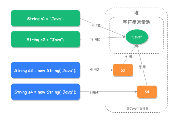 从图中可以看出 s1 和 s2 的引用一定是相同的,而 s3 和 s4 的引用是不同的,对应的程序代码如下: