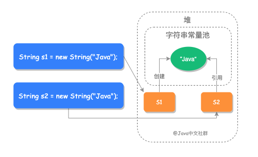 认为 new 方式创建了 2 个对象的人认为,new String 会在堆上创建一个对象,并且在字符串常量池中也创建一个字符串。