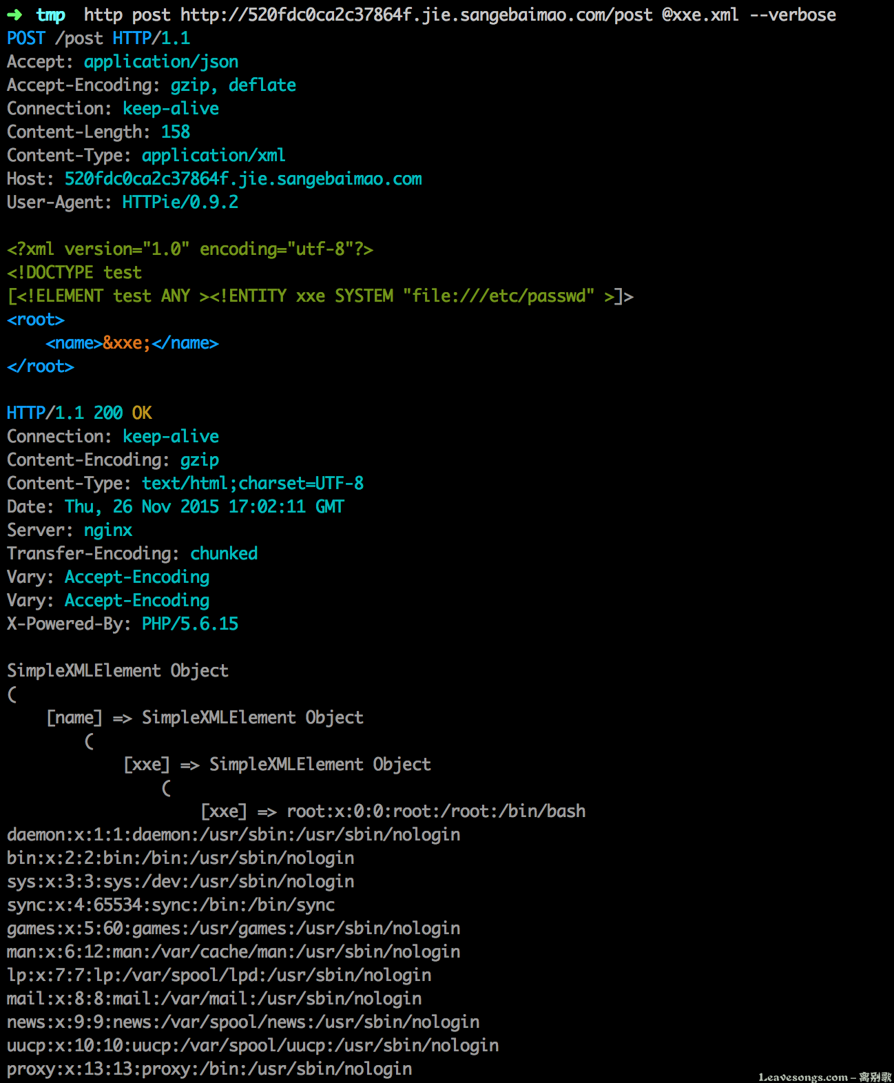 可见这里直接调用了simplexml_load_string解析$input,造成XML实体注入漏洞。