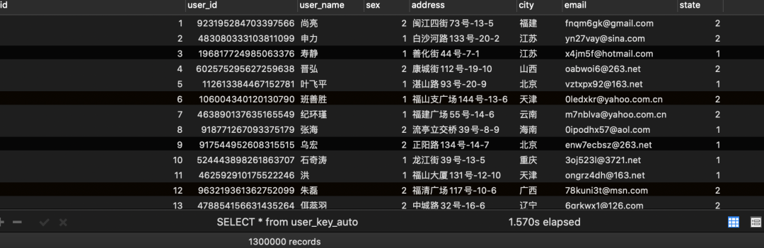 根据控制变量法,我们只把每个表的主键使用不同的策略生成,而其他的字段完全一样,然后测试一下表的插入速度和查询速度: