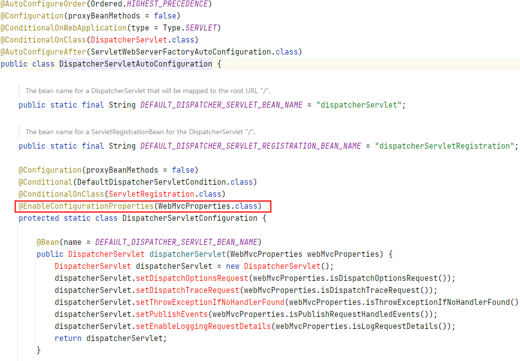 }其中@SpringBootConfiguration底层是@Configuration注解,它表示主启动类是一个配置类;而@ComponentScan是扫描注解,它默认扫描的是主启动类当前包及其子包下的组件;最关键的就是@EnableAutoConfiguration注解了,该注解便实现了自动配置。