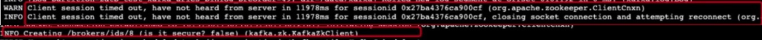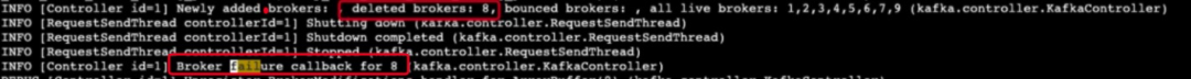 [Controller id=1] Broker failure callback for 8 (kafka.controller.KafkaController) 控造器将节点8从集群的在线中移除,控造器为什么会将节点8移除呢?接下来顺藤摸瓜,去看一下节点8上的日记如下图所示: