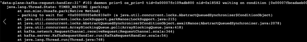 3、问题阐发一看到动静发送响应时间长,我的第一反响是查看线程栈,是不是有锁阻塞,但查看线程仓库发现Kafka用于处置恳求的线程池大部门都阻塞在获取使命处,表白“无活可干”形态: