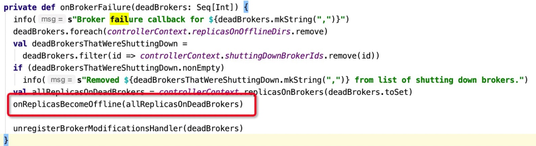 3.1 通俗Broker节点被移除处置入口为:KafkaController的onBrokerFailure办法,代码详情如下图所示: