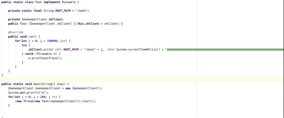 若是存在大量的zk更新操做,心跳包可能会处置不及时,而在呈现zookeeper session会话超时之前,集群在大面积ISR扩张与收缩,频繁更新zk,从而触发了客户端端心跳超时,那个问题也能够通过如下代码停止复现: