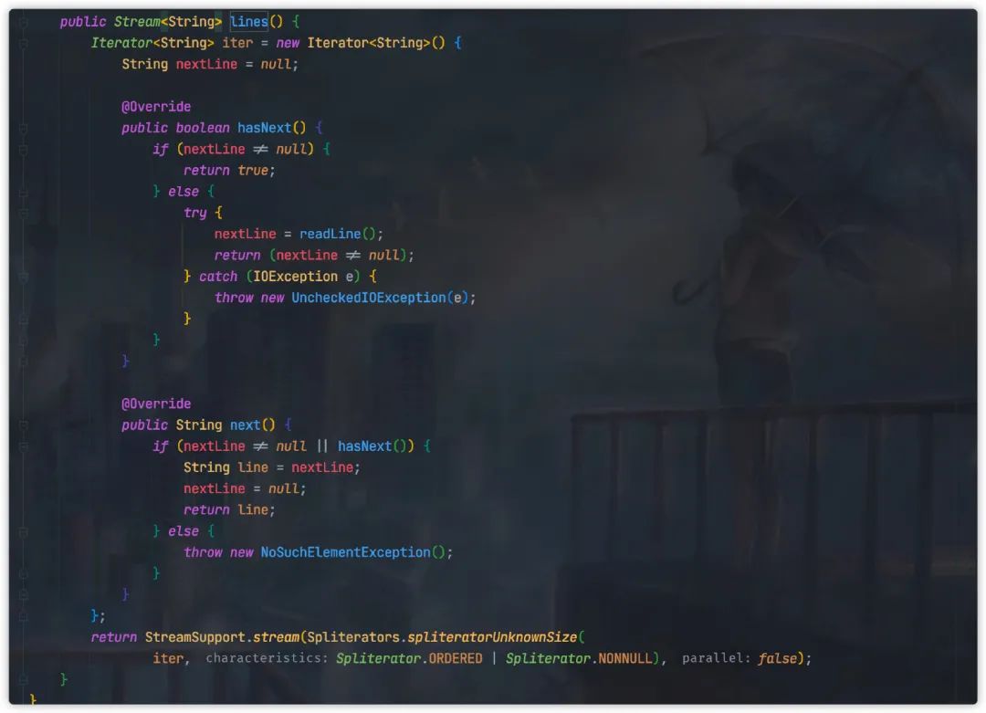 Files.lines(Paths.get("文件途径"), Charset.defaultCharset()).forEach(line -> { convertToDB(line);});其实认真看下 Files#lines底层源码,其实原理跟上面的 LineIterator类似,同样也是封拆成迭代器形式。