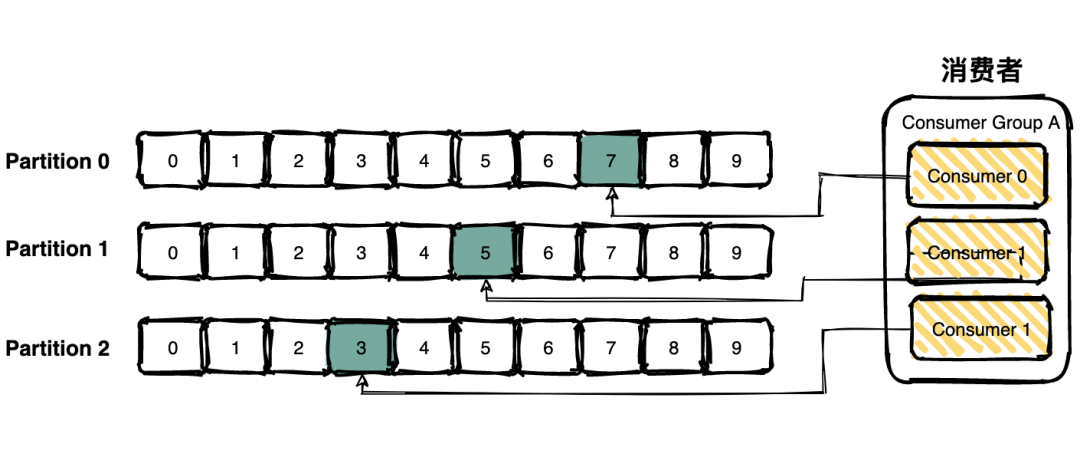 多个消费者能够构成一个消费者组(consumer group),每个消费者组都有一个组id。统一个消费组者的消费者能够消费统一topic下差别分区的数据,但是不会呈现多个消费者消费统一分区的数据。