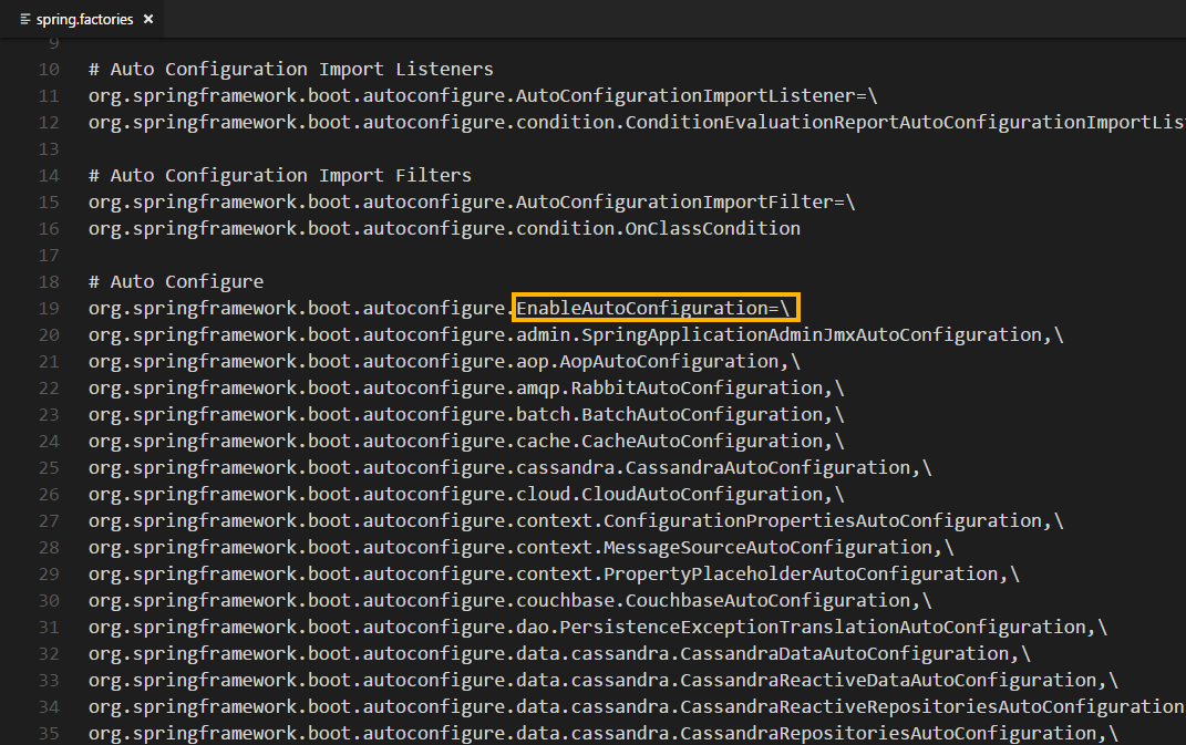 最末通过 SpringFactoriesLoader.loadFactoryNames(),在内部的函数挪用里读取了 ClassPath 下面的 META-INF/spring.factories 文件来获取所有导出类。而spring.factories文件里关于 EnableAutoConfiguration的设置装备摆设其实就是一个 “键值对” 构造,样子大要长下面如许: