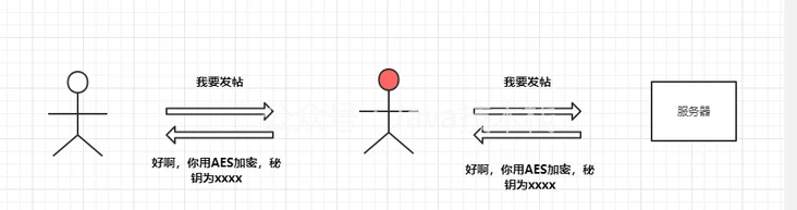 两边约定加密体例 利用 AES 加密报文如许看似中间人获取不到明文信息了,但其其实通信过程中仍是会以明文的体例表露加密体例和秘钥,若是第一次通信被拦截到了,那么秘钥就会泄露给中间人,中间人仍然能够解密后续的通信:
