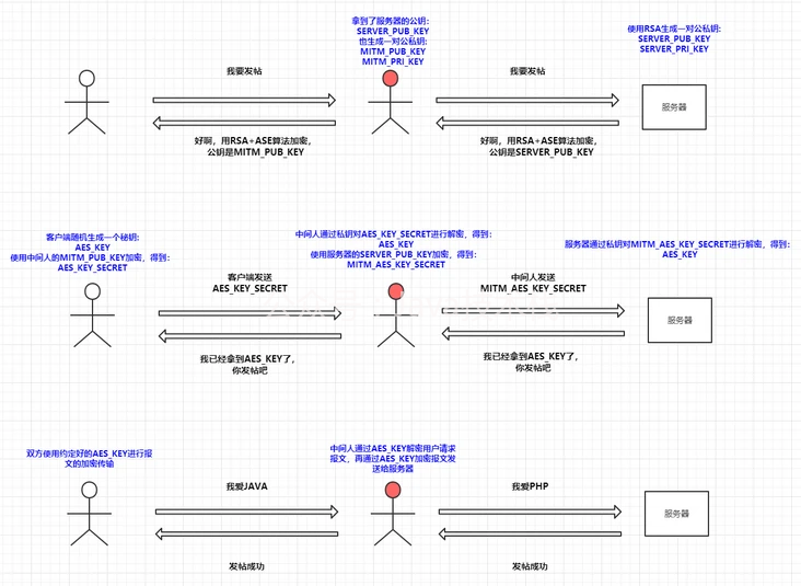 所谓道高一尺魔高一丈,中间报酬了对应那种加密办法又想出了一个新的破解计划,既然拿不到AES_KEY,那我就把本身模仿成一个客户端和办事器端的连系体,在用户->中间人的过程中中间人模仿办事器的行为,如许能够拿到用户恳求的明文,在中间人->办事器的过程中中间人模仿客户端行为,如许能够拿到办事器响应的明文,以此来停止中间人攻击: