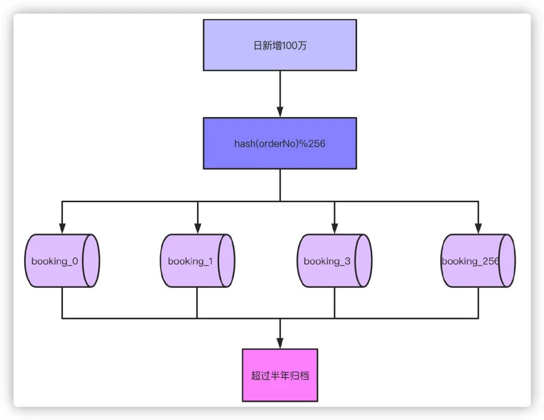 通过火表加上超越半年的数据归档之后,单表70万的数据就足以应对大部门场景了。接下来对订单号hash,然后对256取模的就能够落到详细的哪张表了。