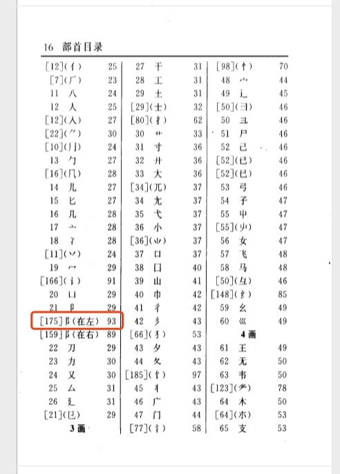 新华字典里还有一种目录被称为“部首目录”,下面可以看到,要使用这个目录我们首先会根据部首的笔画数找到对应该能的部分,然后可以在里面找到我们想找的部首。比如如果我们还是要找 险字所在的位置: