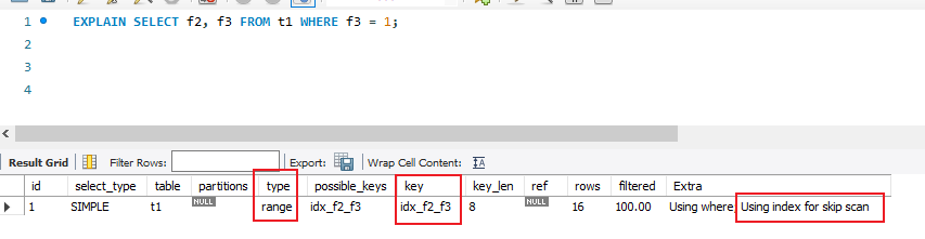 我直接把 f2 的值随机化了,这样 f2 的基数就变大了,可以看到此时再执行查询语句就用不上了Using index for skip scan了。