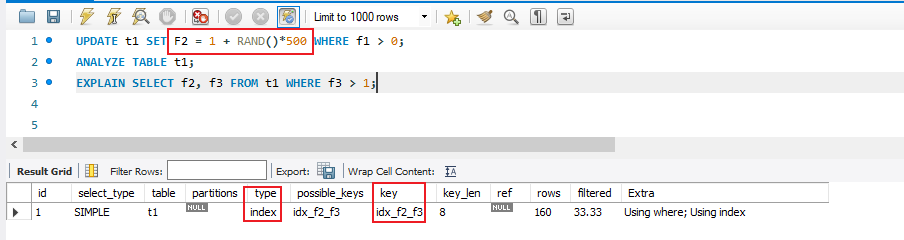 先执行了一下ANALYZE TABLE t1; 更新了一下表的统计信息,防止 MySQL 误判。