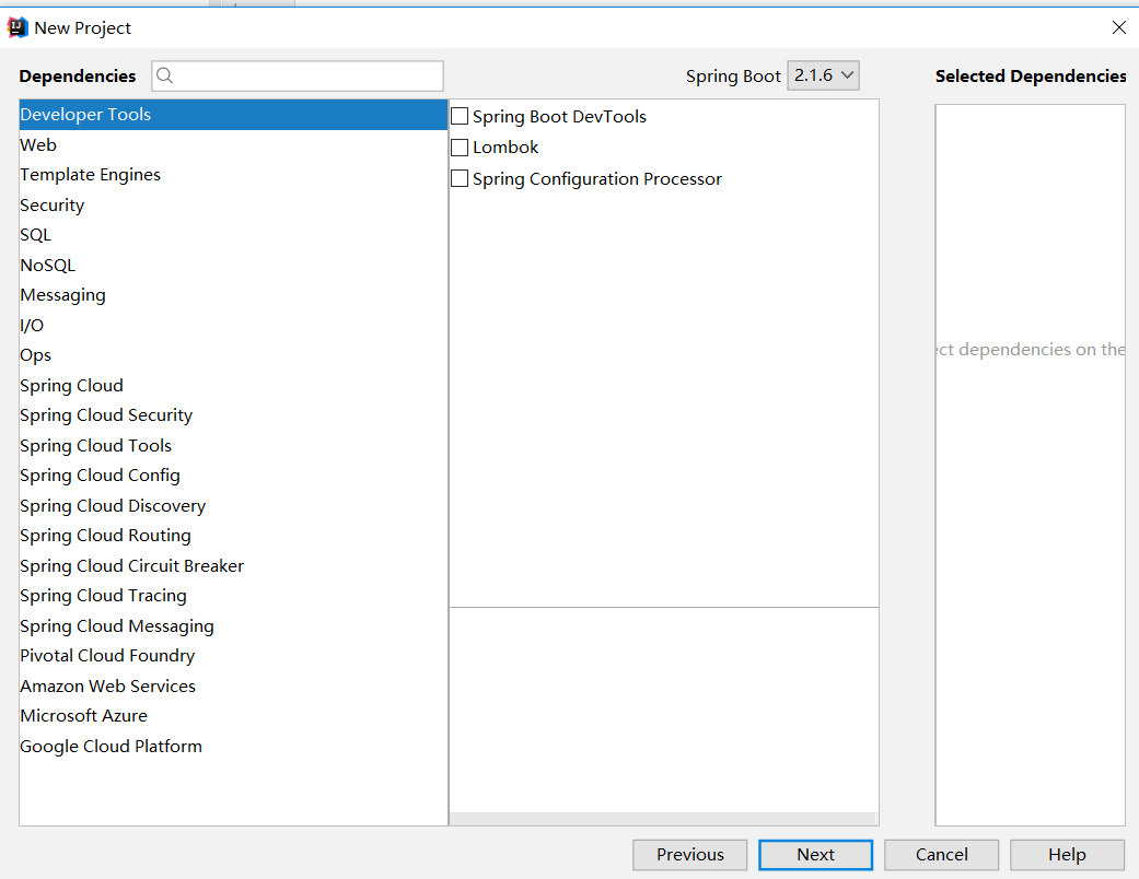 在这里可以选择我们需要依赖的第三方软件类库,包括spring-boot-web,mysql驱动,mybatis等。我们这里暂时先不添加任何依赖,我们后文手动添加maven依赖。这样更有益于理解。等你熟悉了maven依赖项,可以再次回到这里尝试勾选。