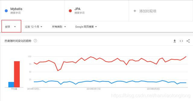 图中蓝色线条为Mybatis搜索量,绿色为JPA搜索量。如果你换一个国外的搜索指数,你会得到一个完全不同的结果。那么这是为什么呢?我们还要从JPA的特点说起: