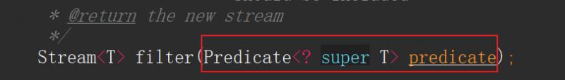 下面要说我们的重点了,通过之前的章节的讲解,我们已经知道lambda表达式表达的是一个匿名接口函数的实现。那具体到Stream.filter()中,它表达的是什么呢?看下图:可以看出它表达的是一个Predicate接口,在英语中这个单词的意思是:谓词。