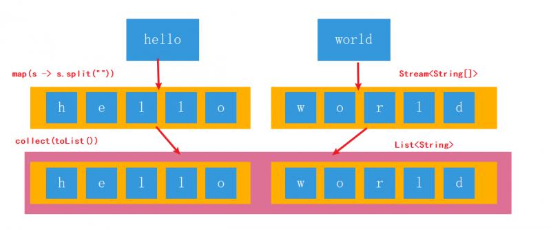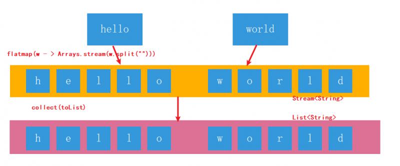 .flatMap(w -> Arrays.stream(w.split(""))) // [h,e,l,l,o,w,o,r,l,d]